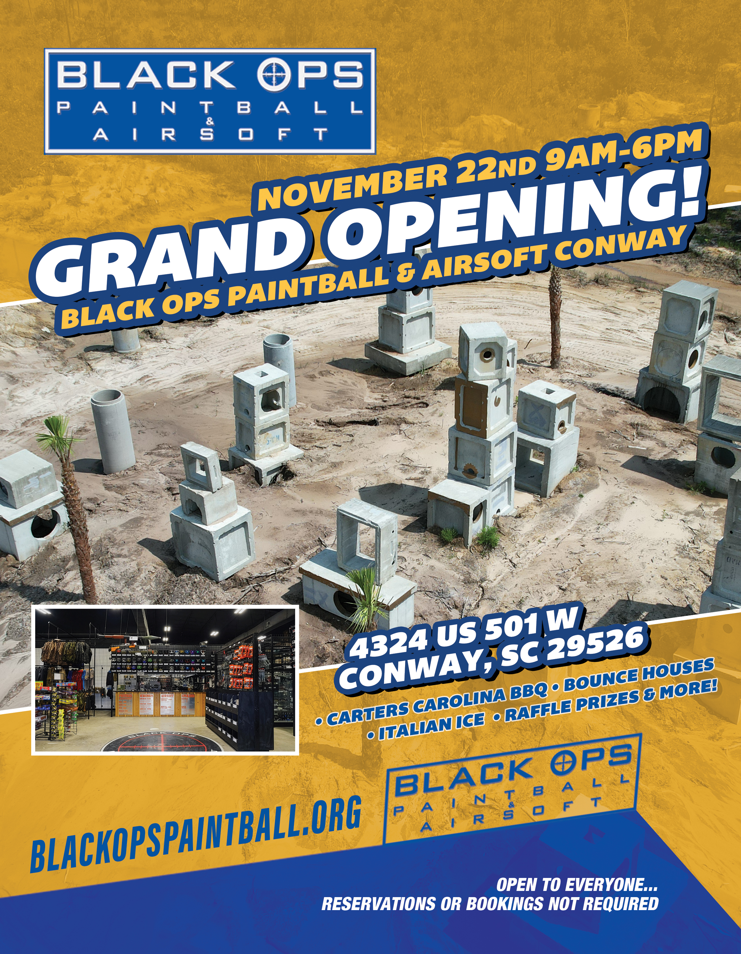 Join us for the Grand Opening of Black Ops Paintball & Airsoft in Conway, South Carolina! Experience the ultimate day of fun with paintball and airsoft games perfect for new players, bounce house from RC Inflatables, raffle prizes, and more. Enjoy delicious food from Carters Carolina BBQ and cool off with refreshing Italian Ice and Myrtle Beach Booze Pops while exploring our brand-new outdoor fields and pro shop.